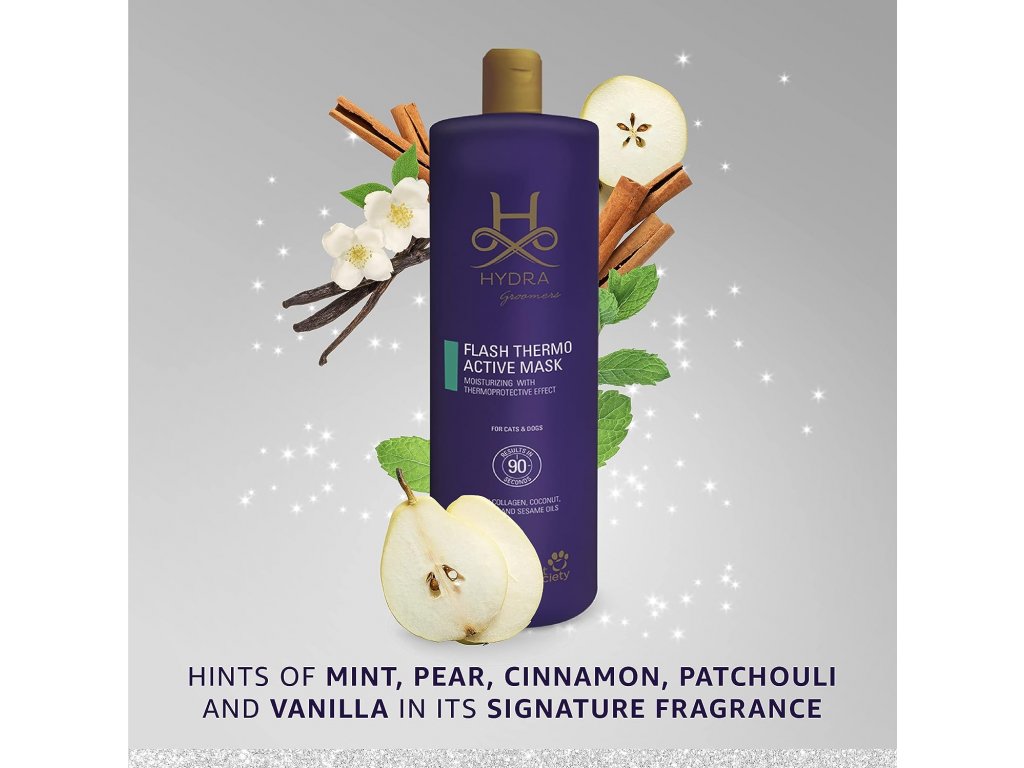 Maska je určena pro profesionální použití u psů a koček pro rychlou hydrataci srsti. Zvyšuje pružnost srsti a obsahuje kolagen pro redukci krepatění. Směs kokosového, arganového a sezamového oleje s přídavkem vitaminu E hloubkově hydratuje, zvláčňuje a restrukturalizuje kůži a srst. Termoochranné složky vytvářejí na srsti film, který ji chrání před poškozením způsobeným teplem, a to i za mokra. Pro ještě lepší výsledky doporučujeme kromě masky používat i termoaktivní sprej Hydra. Jedná se o profesionální výrobek navržený groomery pro groomery a je vhodný pro všechna plemena psů a koček, u kterých je vyžadována rychlá hydratace. Jedna velikost, 900 ml.