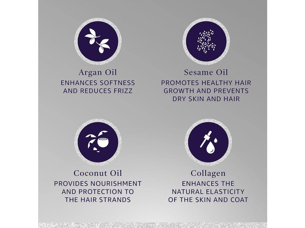 AKTIVNÍ SLOŽKY: Náš kondicionér pro psy a kočky oživí srst vašeho domácího mazlíčka, zanechá ji hydratovanou a s přirozeným leskem. Obsahuje kolagen a arganový, sezamový a kokosový olej. Tyto složky zvyšují vlhkost a snižují zacuchávání.