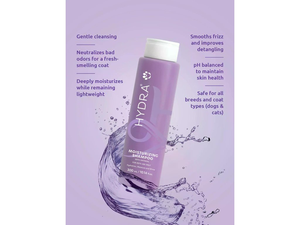 Luxusní, hydratační a pH-vyvážený šampon, který jemně čistí a zvýrazňuje přirozenou krásu srsti vašeho mazlíčka. Hydra Moisturizing Shampoo obsahuje zklidňující ovesný extrakt a přírodní složky neutralizující zápach.