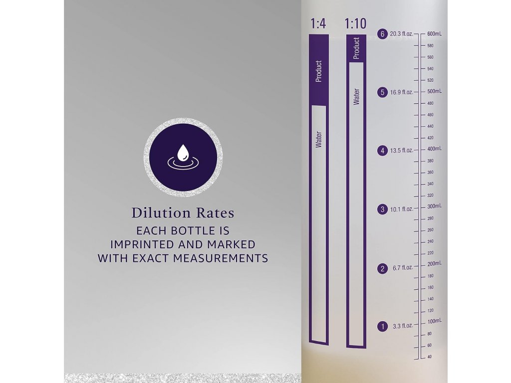 MÍRY: Dodržujte doporučení pro ředění výrobku, abyste zajistili čistotu a správnou péči o pokožku. Naše průhledná láhev má na vnější straně značky pro měření uncí a mililitrů, takže si můžete být vždy jisti, že mícháte správně.