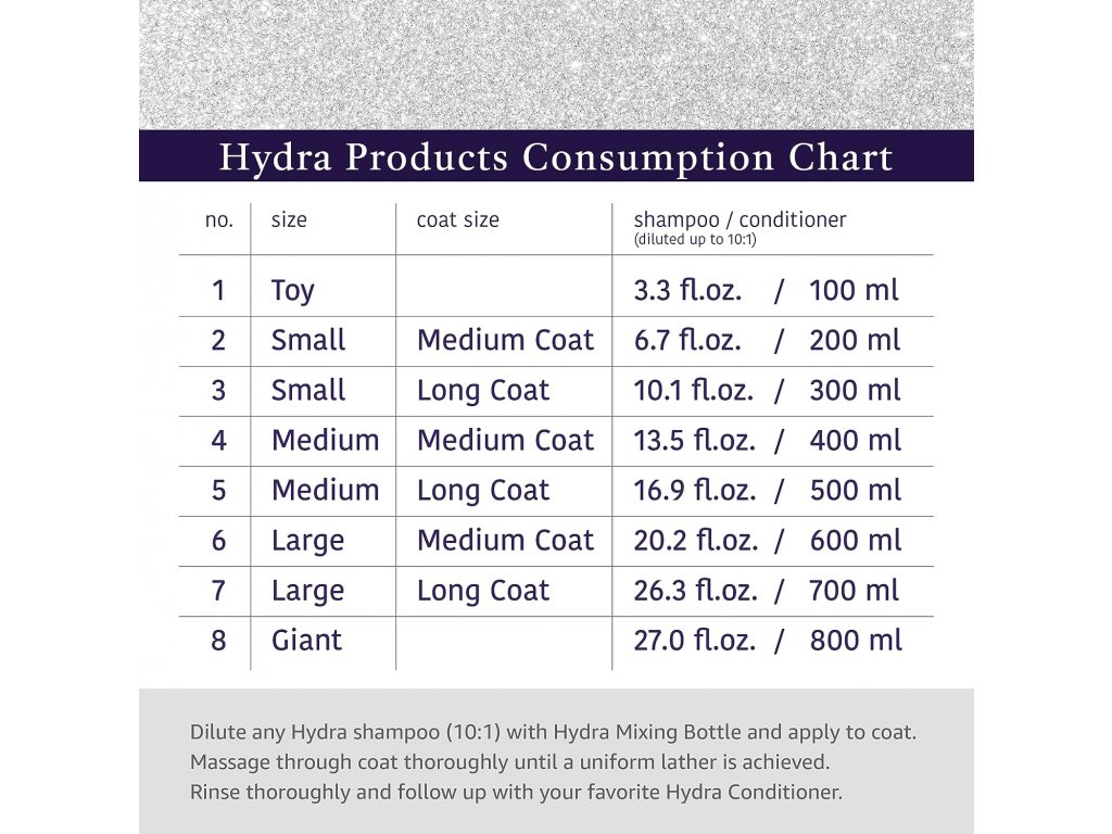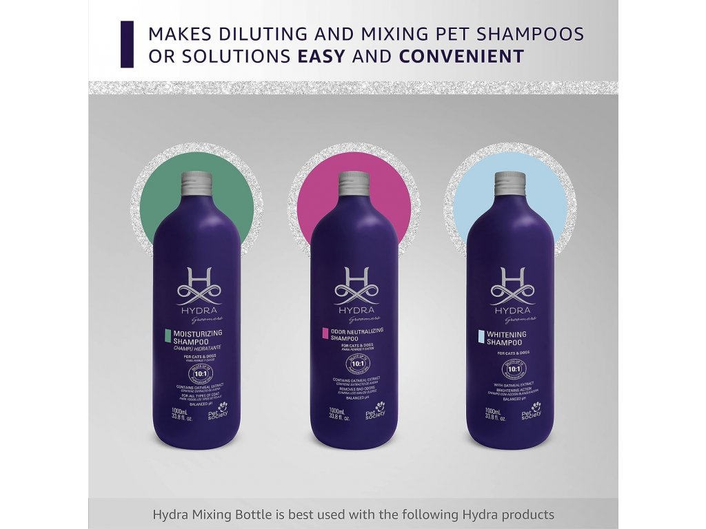 PÉČE O SRST: Tuto ředicí láhev můžete použít k míchání našich šamponů, kondicionérů a dalších přípravků pro péči o srst na úrovni salonu. Zářivý lesk s přípravkem Hydra.