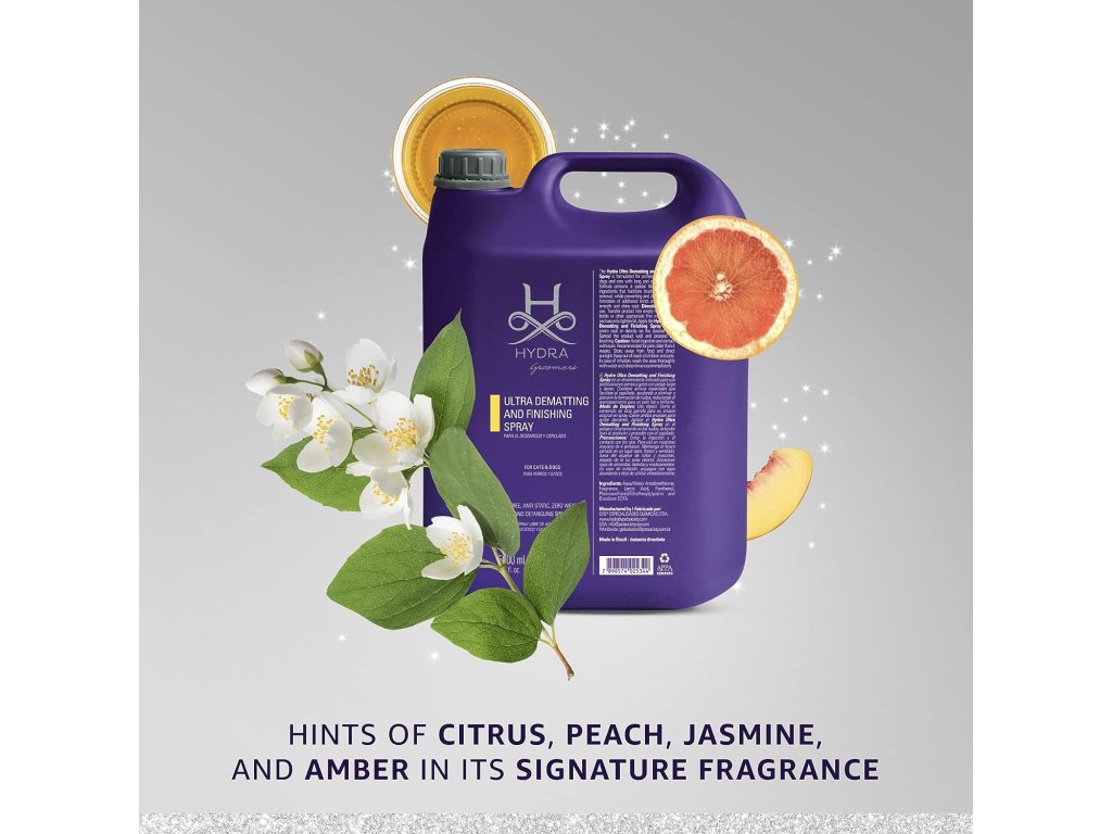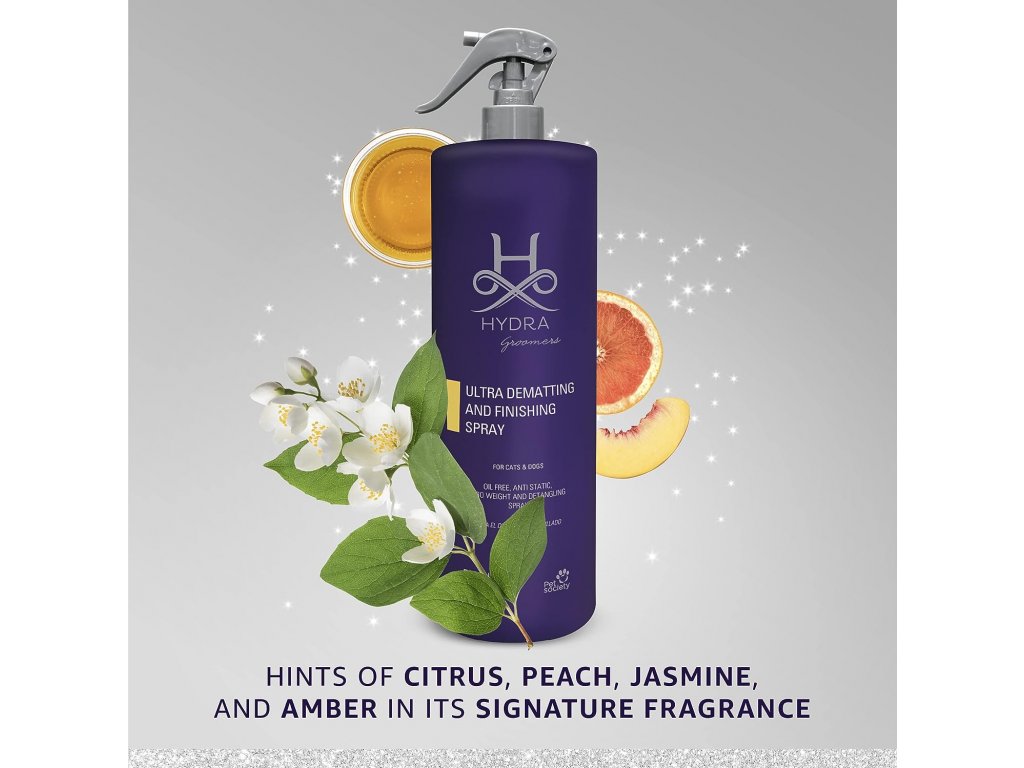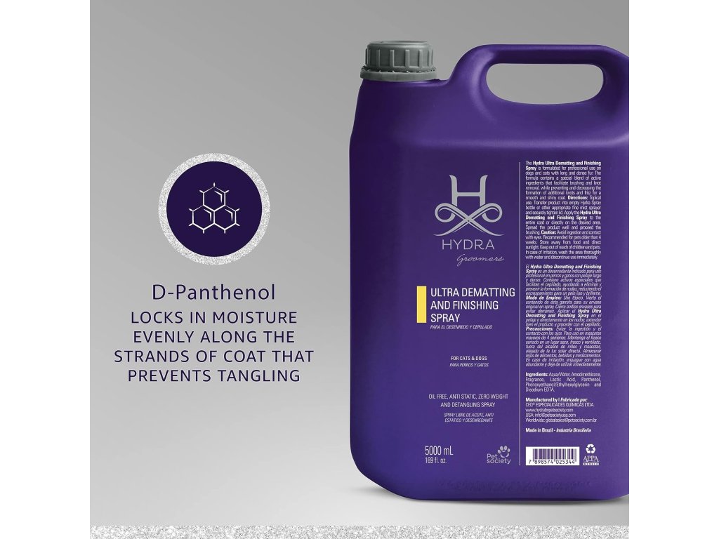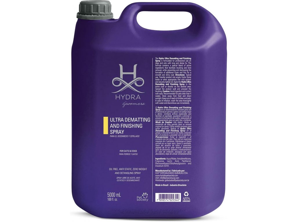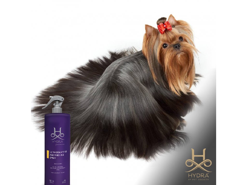 Hydra ultra rozčesávací a finální sprej je určen pro profesionální použití u psů a koček s dlouhou a hustou srstí. Složení obsahuje speciální směs účinných látek, které usnadňují vyčesávání a odstraňování zacuchání a zároveň zabraňují a snižují tvorbu dalších uzlíků a zacuchání pro hladkou a lesklou srst. Tento speciální sprej zkracuje čas strávený kartáčováním a rozčesáváním a zároveň dodává srsti lesk a hebkost.