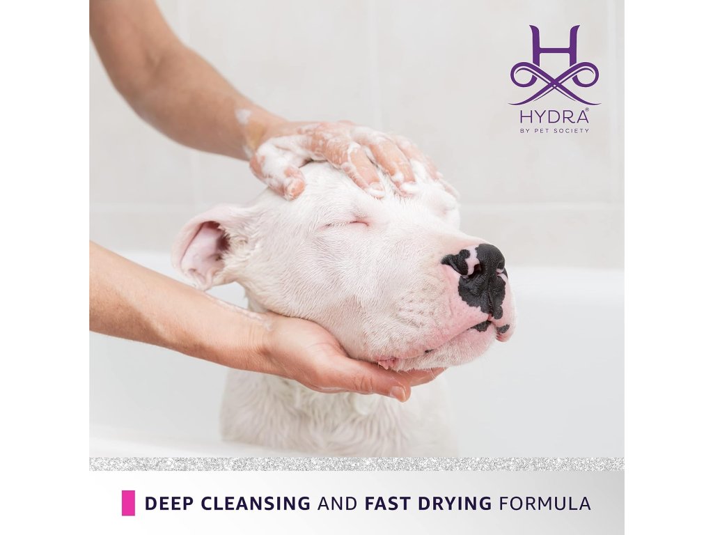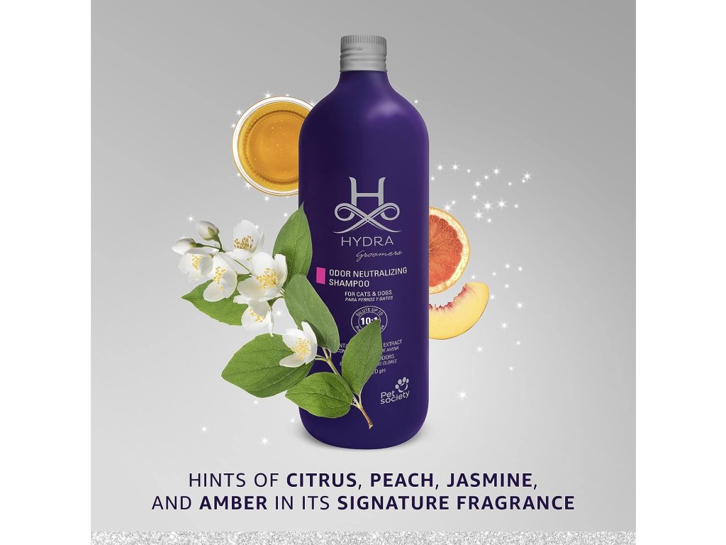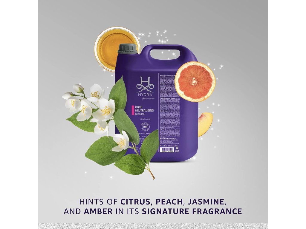Šampon Hydra pro neutralizaci zápachu je určen pro profesionální použití u psů a koček, obsahuje olej z hroznových jader a výtažek z ovsa, který hydratuje a zklidňuje kůži a srst. Exkluzivní systém neutralizace zápachu částečně otevírá kutikulu, což usnadňuje odstranění nečistot a zároveň podporuje hloubkové čištění srsti. Jedinečné vlastnosti tohoto šamponu usnadňují vyplachování a umožňují rychlejší schnutí srsti. Jedná se o profesionální šampon navržený groomery pro groomery a je vhodný pro všechna plemena psů a koček. Úsporný při použití, může být ředěn v poměru 10:1. K dispozici ve velikostech 1 l a 5 l.